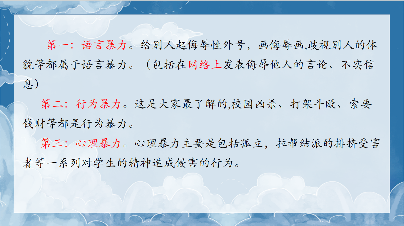 网络既为青少年打开了看世界的窗口,也潜藏着欺凌、诈骗、不良信息诱导等 “暗礁”;“键盘暴力”“线上挑衅” 等网络欺凌行为,正成为危害未成年人身心健康的新隐患。宣讲中,检察官以真实案例向同学们重点解读了《未成年人保护法》有关网络欺凌的定义及法律条文:2021 年 6 月 1 日起实施的《未成年人保护法》明确,网络欺凌属于校园欺凌的一种,包括语言暴力(网络上发表侮辱言论、不实信息)、行为暴力、心理暴力(孤立、排挤他人)等,只要造成他人人身伤害、财产损失或精神损害,就要承担责任。