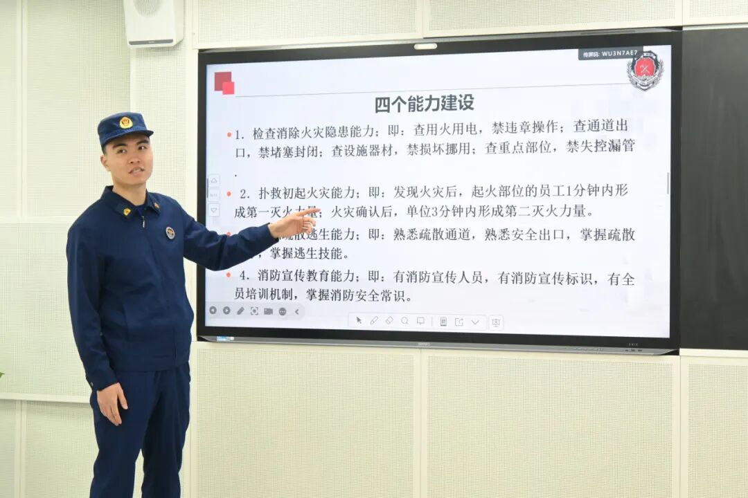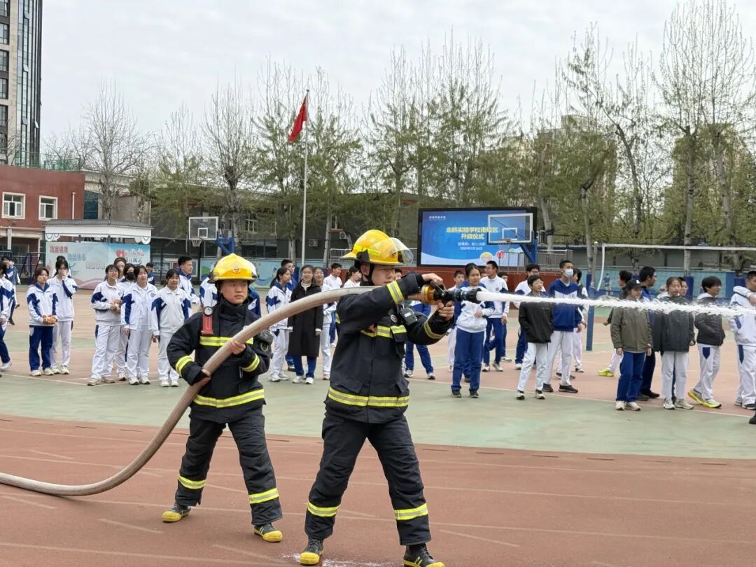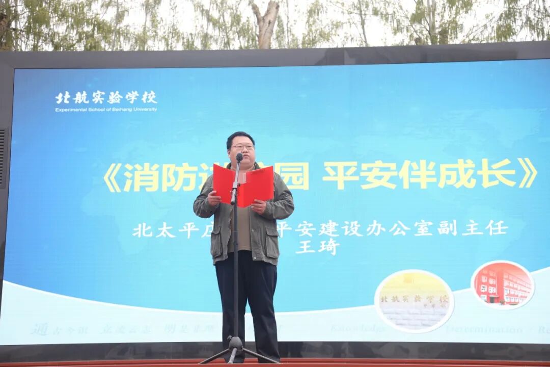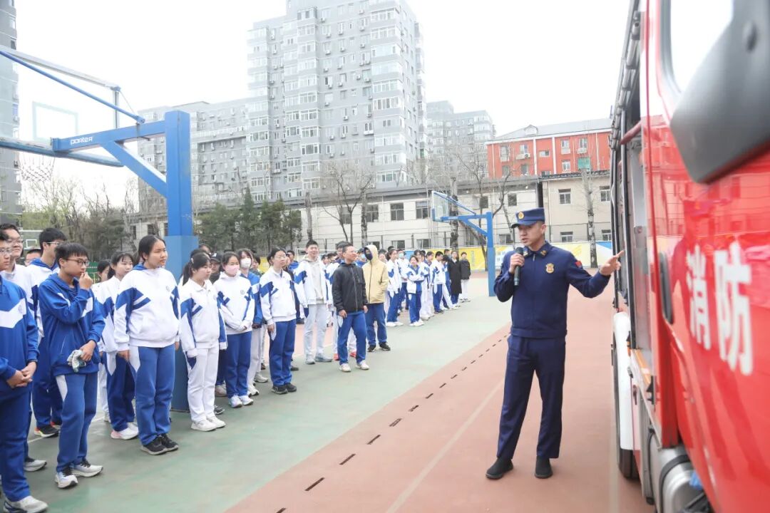伴随着警报响起,“浓烟”升起,南校区的消防疏散演练正式开启,各楼层、各点位负责老师迅速到达指定岗位,指导学生有序疏散。全体学生在老师的引导下,弯腰低姿、捂住口鼻,按照预定路线快速有序地撤离至操场安全区域进行集结。升旗仪式上,北太平庄街道平安建设办公室副主任王琦老师用鲜活的案例、实用的知识,为同学们细致讲解了火灾防范与火场逃生的核心要点,让大家深刻认识到“安全无小事,防患于未然”的重要意义。