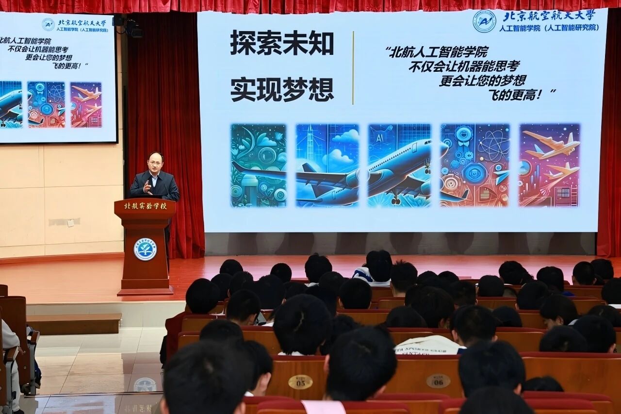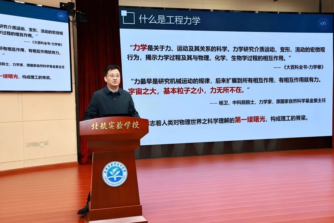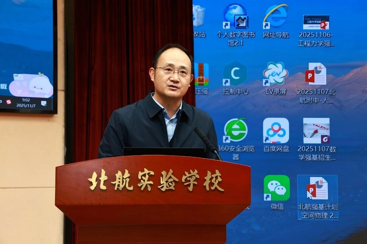2025年11月7日,北京航空航天大学五大热门专业宣讲报告会在北航实验学校中学部阶梯教室隆重举行,小阶梯教室同步直播。本次活动由北航实验学校校长宋友主持并致开场辞。北航实验学校党委书记马树微亲临现场,高中各年级及初三年级部分学生、家长共同参会。活动荣幸邀请到中国科学院院士、北京航空航天大学空间与地球科学学院院长、著名空间物理科学家曹晋滨教授,北京航空航天大学航空科学与工程学院书记董雷霆教授,北京航空航天大学物理学院副院长金硕教授,北京航空航天大学数学科学学院副院长梁湘玉教授,北京航空航天大学人工智能学院副院长文晓副教授五位专家亲临解读,为学子们点亮通往顶尖学科的梦想之路。