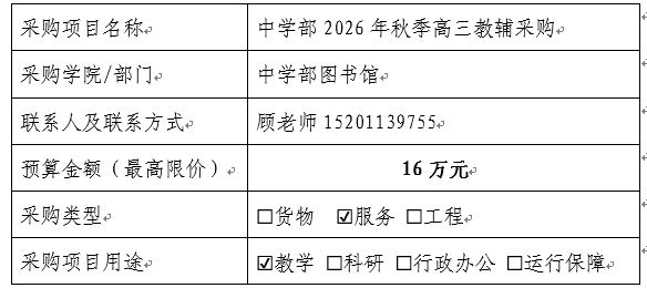 中学部2026年秋季学期高三教辅采购 项目(以下简称“本项目”),经过采购项目可行性、必要性论证,采购资金已落实,已具备采购条件,现邀请有意向且符合条件的供应商参与本项目采购。